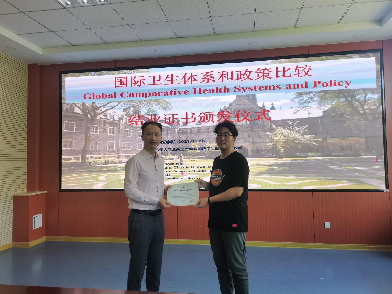 讲座结束后,魏晓林教授为通过《国际卫生体系和政策比较》课程考核的同学颁发结业证书,并与国际合作交流处(国际教育学院)负责人就人才联合培养、学术交流与合作等方面进行了深入交流,达成初步合作意向。