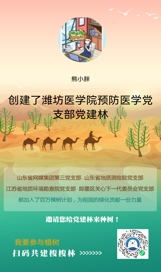 疫情防控时期,预防医学党支部党员同志们虽然只能线上参与,但是仍抵挡不住为绿色家园建设贡献力量的热情。通过云平台在线上创建阿拉善地区支部党建林,党员以集体和个人名义共捐赠29棵梭梭树。