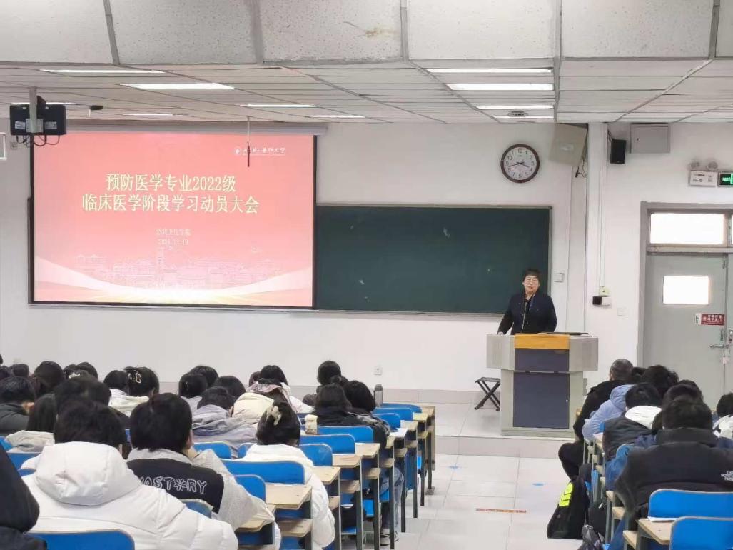 王春平进行临床医学阶段学习动员讲话。她强调临床医学阶段学习公卫人才培养的重要性。一端正学习态度,做到善思乐学,按时完成学校和实习医院交办的各项任务二是高质量完成见实习任务,严格规范临床技能操作,努力提高专业技能,为公卫执业医师资格考试和考研打下扎实的理论基础。三是遵规守纪,服从实习医院的管理,严格执行请销假制度,强化安全意识最后,辅导员针对实习期间纪律、安全等注意事项作出强调。