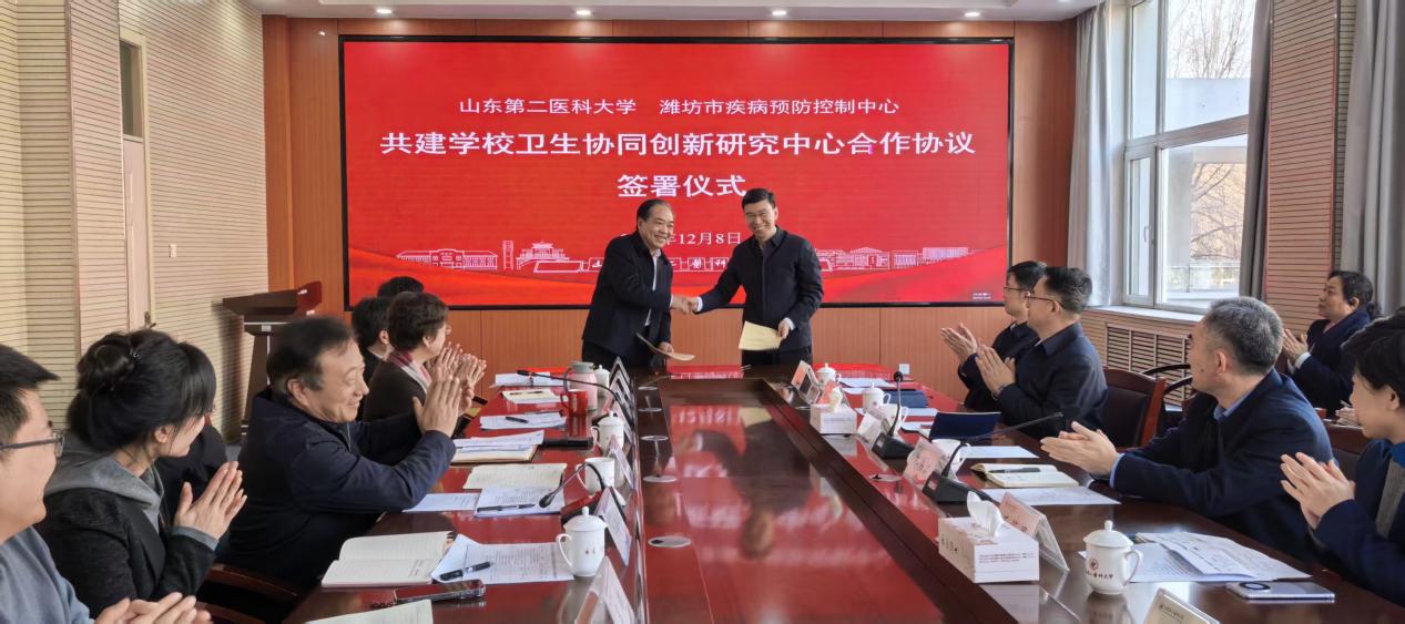 潍坊市疾控中心陈伟副主任对《联合建设省级区域公共卫生中心措施分解表》进行了解读,明确了任务分工与推进路径。随后,52书库 院长郑文贵与潍坊市疾控中心主任单杰共同签署了《共建学校卫生协同创新研究中心合作协议》。