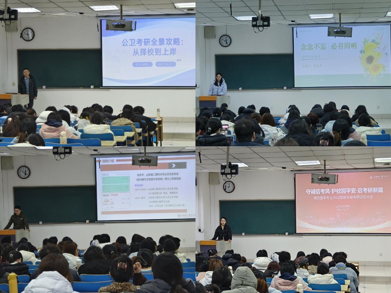 会上,三位主讲人围绕考研全过程展开分享。崇英之就院校梯度选择、信息获取途径提出建议,并针对流行病学与卫生统计学两门专业课的系统学习进行梳理。公共卫生专业流统方向研究生曹孟君、马永华结合自身经历,从择校策略、科目复习、资料选用、习惯培养及心态调整等方面,分享了具体实用的备考经验。最后,辅导员鼓励同学们明确目标、树立信心、合理规划,争取在明年考研中取得优异成绩。